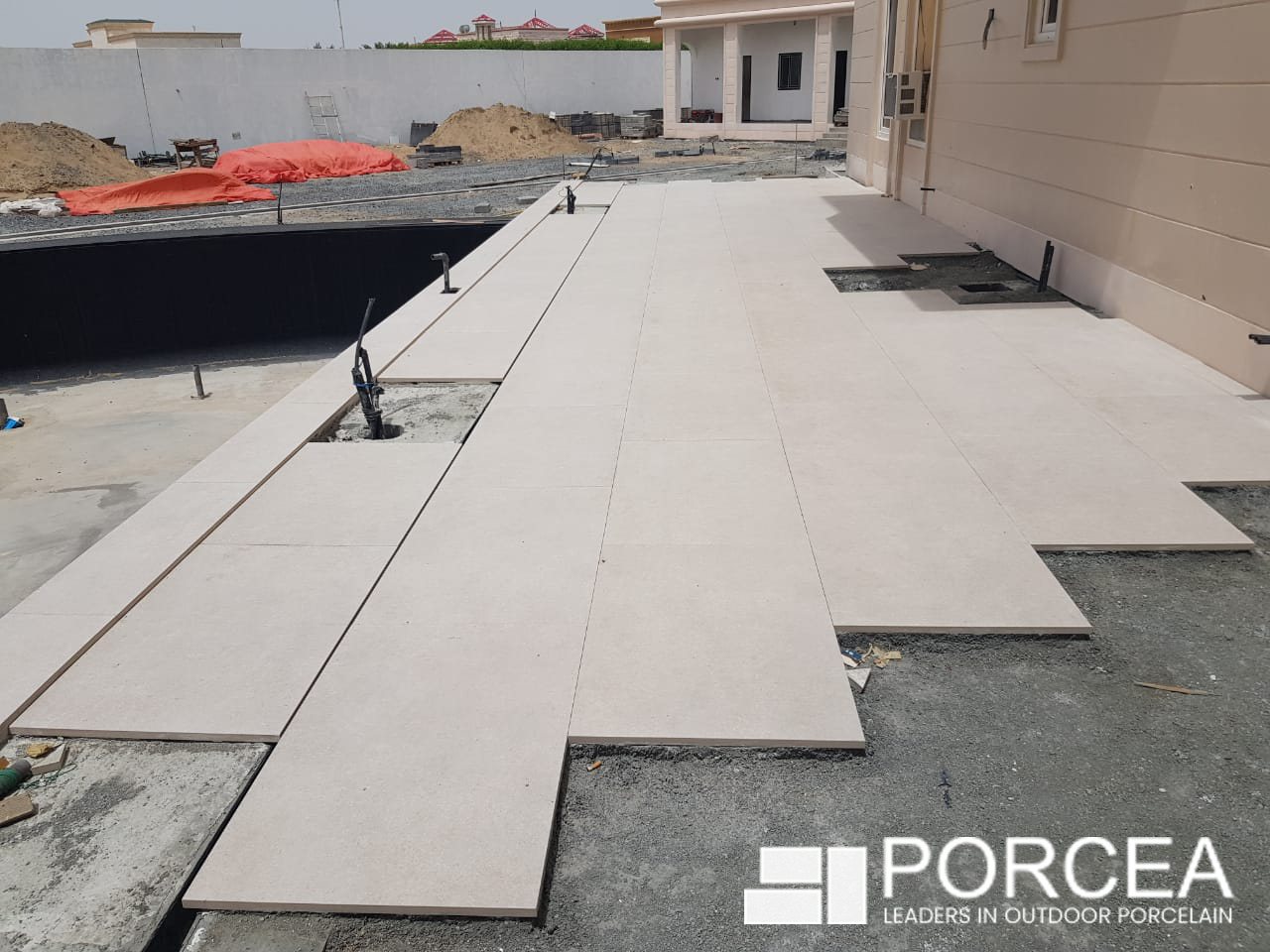 â€Porcea Coast is a light beige outdoor porcelain tile, available in 2 cm thickness. Outdoor porcelain is suitable for all applications including patios, walkways, pool decks, pedestrian commercial traffic, building facades, veneers, and even vehicular traffic with a concrete base.