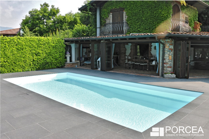 Black granite has been one of the most popular choices in natural stone for a countless number of years. Black granite is one of the most versatile natural stones as it is used indoors for countertops in kitchens, and outdoors for pool decks, patios, and commercial buildings. Porcea Nero is the closest match to black granite in porcelain tiles that is available in North America. It has a slight texture, a beautiful sparkle that is traditionally achieved from flaming natural stone, and it is suitable for all outdoor applications. Porcea Stone has worked tirelessly on Porcea Nero to perfect the true colour of this outdoor porcelain paver in order to ensure it is a match to the most exotic (and expensive) natural stones from Quebec, ON. The dark, black porcelain tile can match any type of masonry or softscaping, and this 3 cm porcelain tile can withstand the test of time, including: