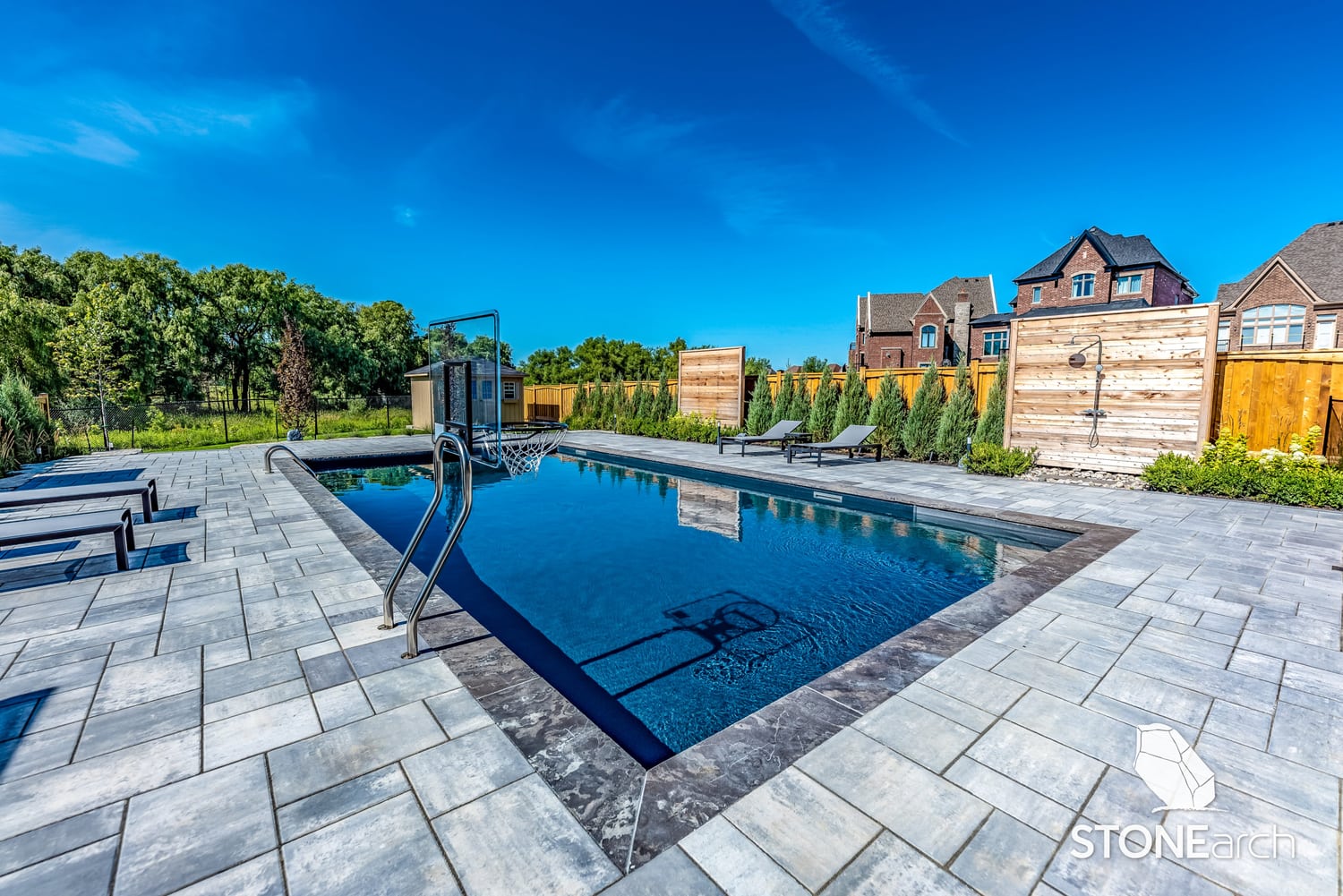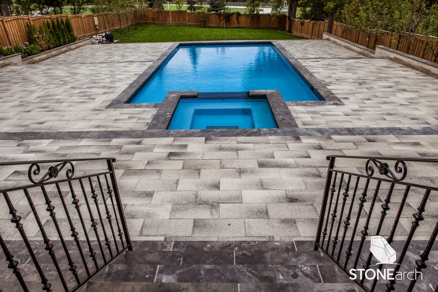Silver Antique is limestone with shades of medium to dark tones of grey & beige. The unique shade of this stone is achieved by acid treatment to the surface. This stone was recently introduced by STONEarch to North American landscape industry and within a short span of time, it has become a premium choice landscape stone for landscape architects, landscape contractors, custom home builders & residential landscape designers. This stone creates the most eye catching, sophisticated, yet elegantly bold landscape for any “Estate Home Landscape”. Silver Antique is usually the first choice as stone, for many modern landscapes. This stone is available in a variety of products such as Pavers, Copings, Wall Copings, Bullnose Pool Copings, Pier Caps, Tumbled Cobbles, Steps, Jumbo Slabs, Curbs, Tiles, etc. Also popularly known as Antique Black, Antique Silver, Hampton Antique,