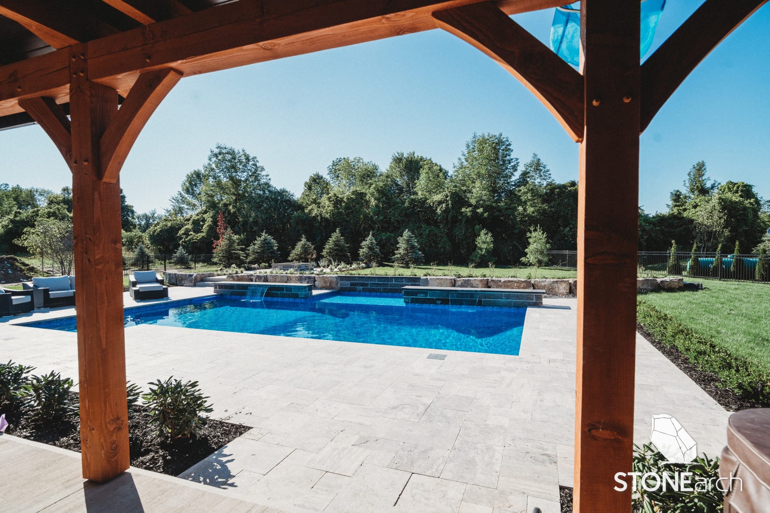 Gray Mix is travertine stone with warm & neutral tones of cream, beige, gray & blue color tones. Honed and tumbled finish of Gray Mix Cobbles gives it the right choice for stone for million dollar homes. These classic tumbled cobbles for pool deck is the most popular landscape stone for landscape architects of Ontario & Quebec. Travertine stone has a porous texture that makes it practical (anti-slilp) and unique in look as well! It is the most friendly stone to bare feet. This stone is a recent introduction to STONEarch’s extensive product range of premium landscape stones. Gray Mix represents premium landscape stone and it is meant for high-end landscape projects. This stone can be used in many modern landscape settings. This stone is available in a variety of products such as Tumbled Cobbles, Straight Edge Copings, Bullnose Copings & Custom Landscape Products.