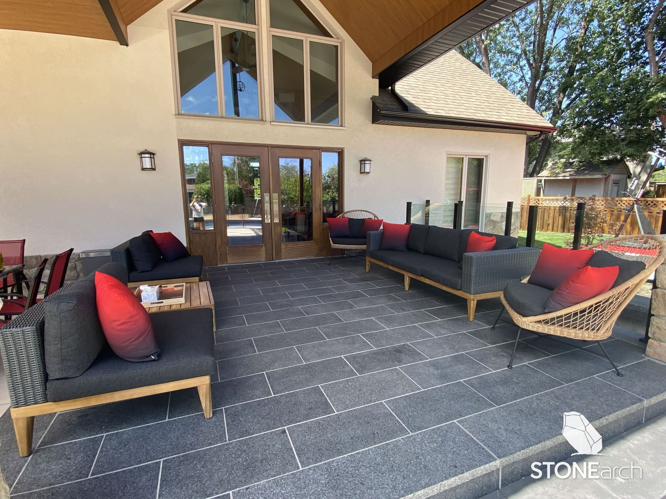 The unique finish on this granite allows for a sparkled appearance, particularly in sunlight, as the fine crystals shine and reflect the sunlight. The surface of the stone has a very unique combination finish included flamed, brushed, and waterjet, allowing for a deep, rich dark black granite. Onyx Black is the top choice for landscape architects looking for a deep rich black granite, and is the most popular stone for pool copings, steps, and ultra-modern walkways & projects. This stone is available in a variety of products such as Pavers, Copings, Wall Copings, Bullnose Pool Copings, Pier Caps, Steps, Curbs, Tiles, etc. Also popularly known by various names like: Jet Black, Black Pearl, Midnight Black, Sombre, and Cambrian Black.
