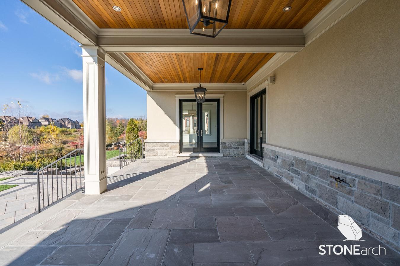 Slate Gray has color tones that range from light to medium shades of gray with a slight hint of beige. It has a very subtle natural surface & striations. This color is suitable for a wide range of applications. It blends well with the natural colors of a garden patio environment and is also dark enough to stand out as a featured entrance stone against lighter background architectures. Due to the neutral shade of this stone – it is the most popular landscape stone for many landscape architects, landscape designers, landscape contractors and estate home builders. This stone creates a stunning landscape for any residential landscape or commercial landscape project. The color of this stone is very trendy and it is complementary to armout rocks. This stone is available in a variety of products such as Pavers, Copings, Wall Copings, Bullnose Pool Copings, Pier Caps, Jumbo Slabs, Cobbles, Steps, Curbs, Tiles, etc. Also popularly known as, Banas Slate Gray, Slate Brown.